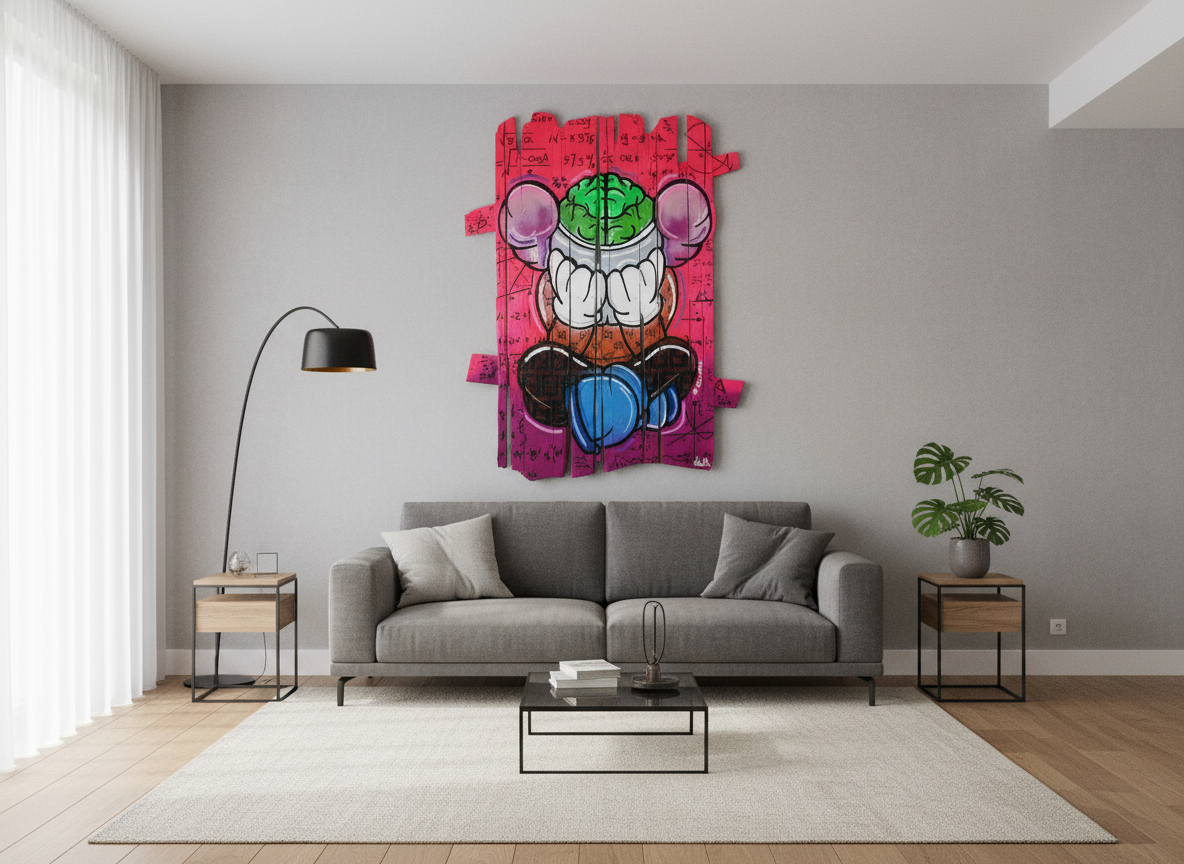 Scopri l’opera pop art che unisce design moderno e materiali unici: una composizione coloratissima su assi di legno con un motivo centrale a forma di cervello. Questo pezzo colpisce per la sua vivacità e per la profondità del messaggio che trasmette, rendendolo perfetto per chi cerca un tocco di originalità nei propri ambienti.