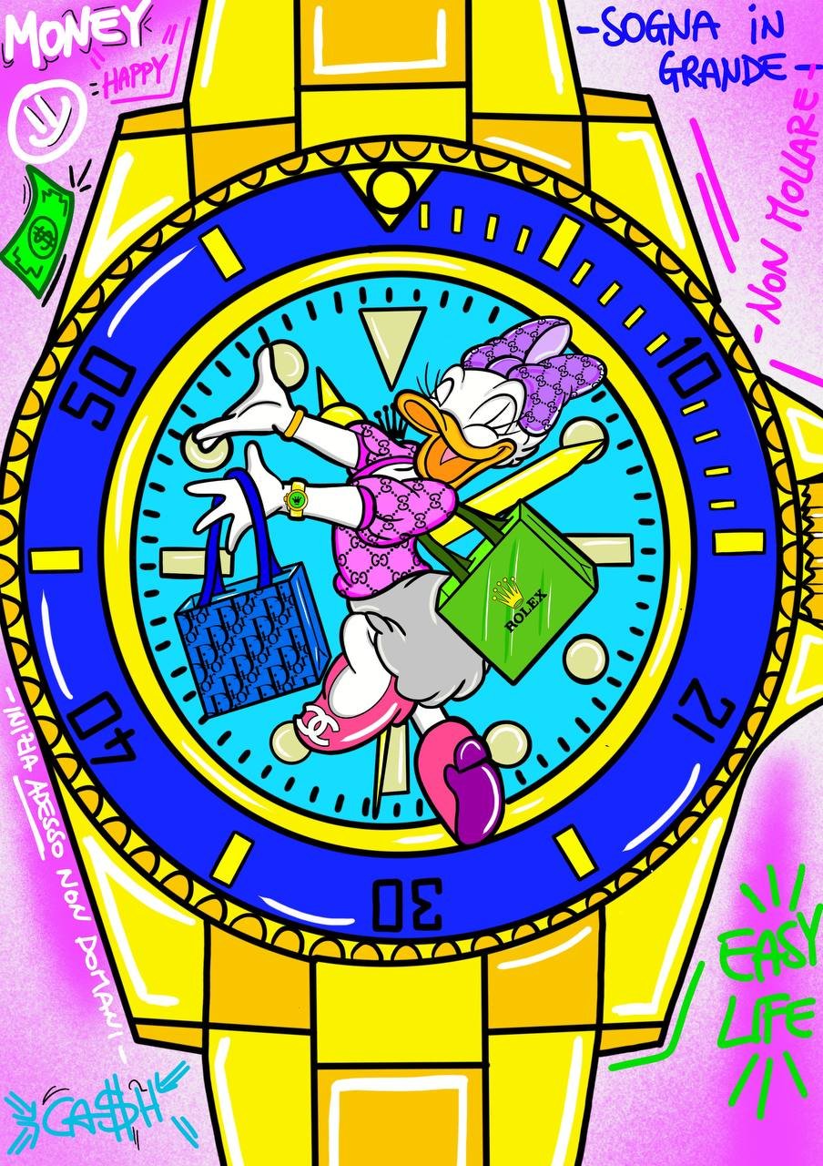 Questa opera è perfetta per decorare salotti, studi, o persino spazi commerciali, aggiungendo un tocco di creatività e carattere. “Paperina su Rolex” non è solo una stampa: è un messaggio di stile e autenticità!